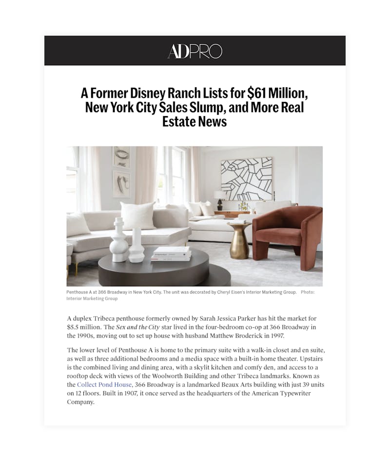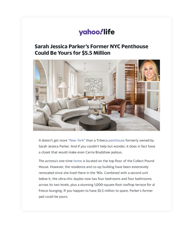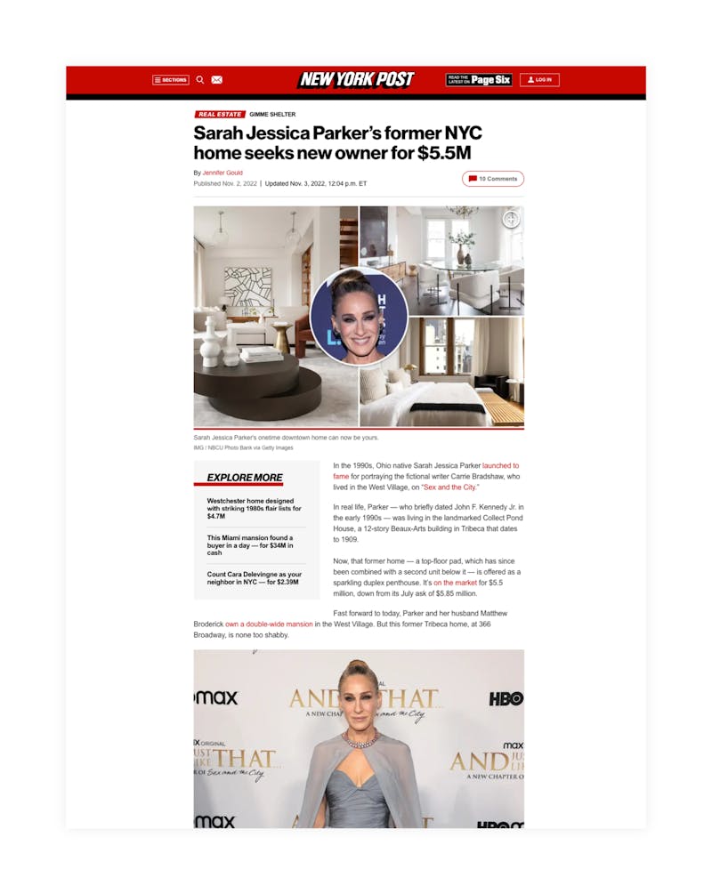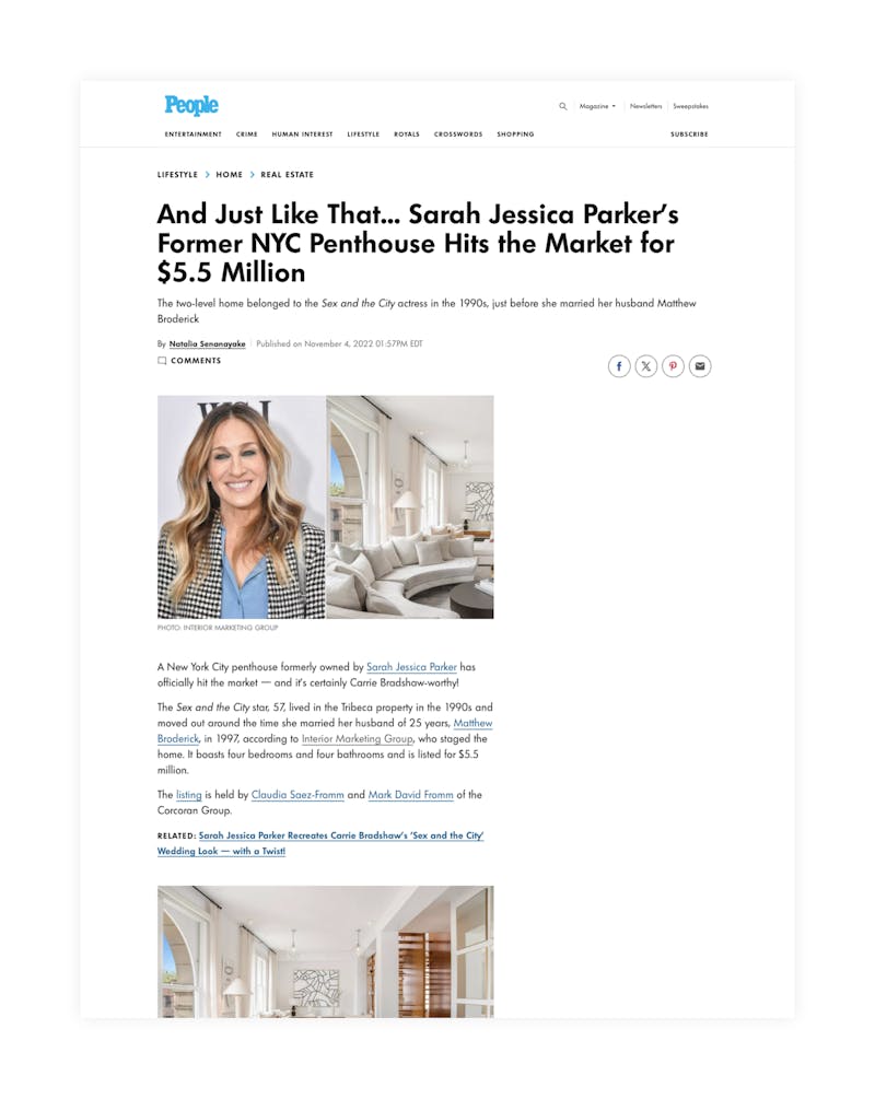 Once upon a time, this Tribeca residence belonged to Sarah Jessica Parker. A more recent iteration became a media darling when IMG staged the listing and gave the interiors a new narrative, landing media placements in the New York Post, People magazine and more.